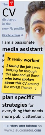 Facebook è stato uno strumento fondamentale anche per qualcun altro, da cui è nato un vero e proprio Curriculum Vitae su Facebook. L'idea è tutta made in Italy e noi non ci siamo fatti sfuggire l'occasione di intervistare il giovane bolognese che ha dato il via ad una pratica ormai fortemente diffusa nel web. Nata come esigenza per l'ottenimento di un posto di lavoro, la creazione di un curriculum su Facebook è stata per Claudio Nader, giovane a cui va tutto il merito e la paternità, una vera e propria svolta a livello lavorativo e in una breve intervista ce lo ha